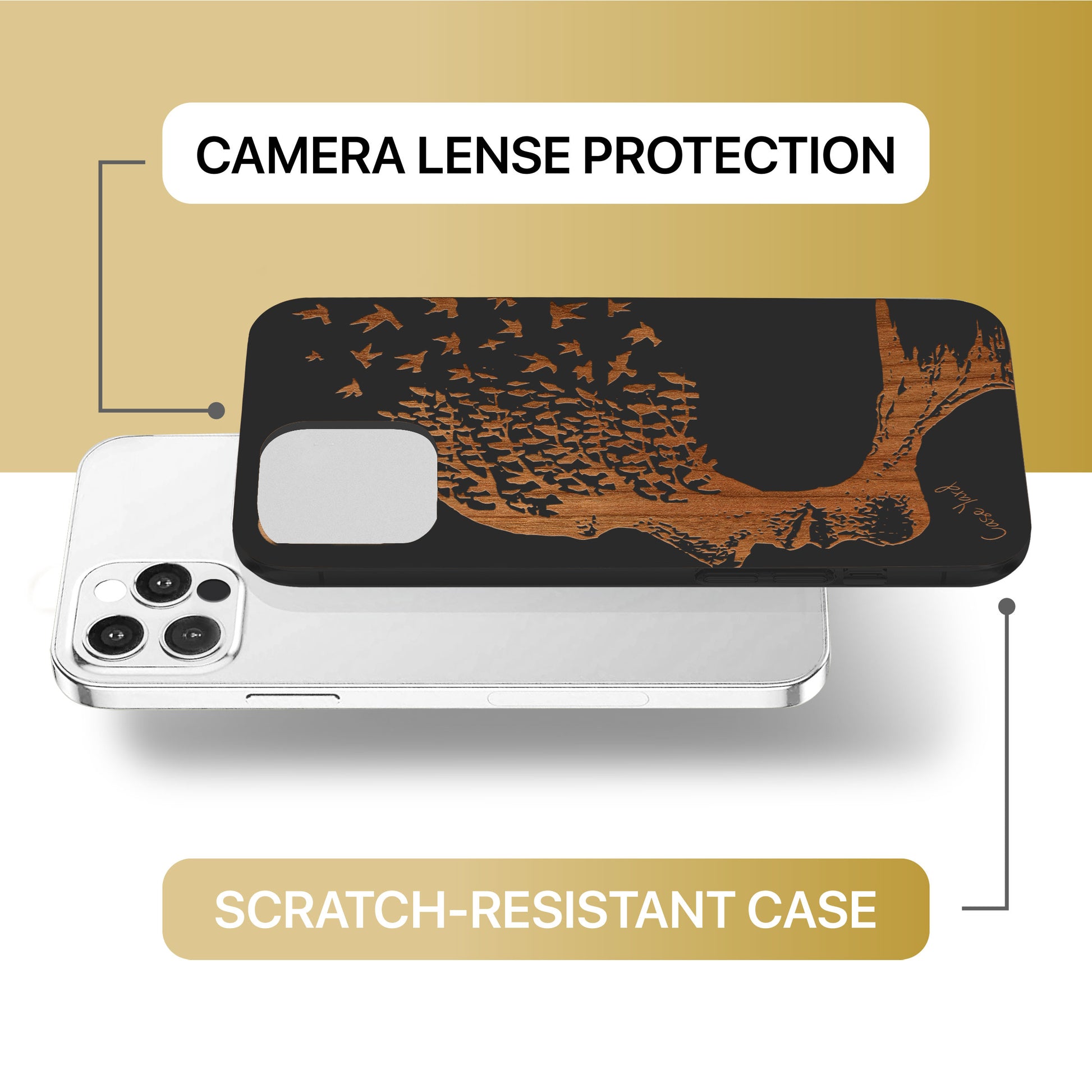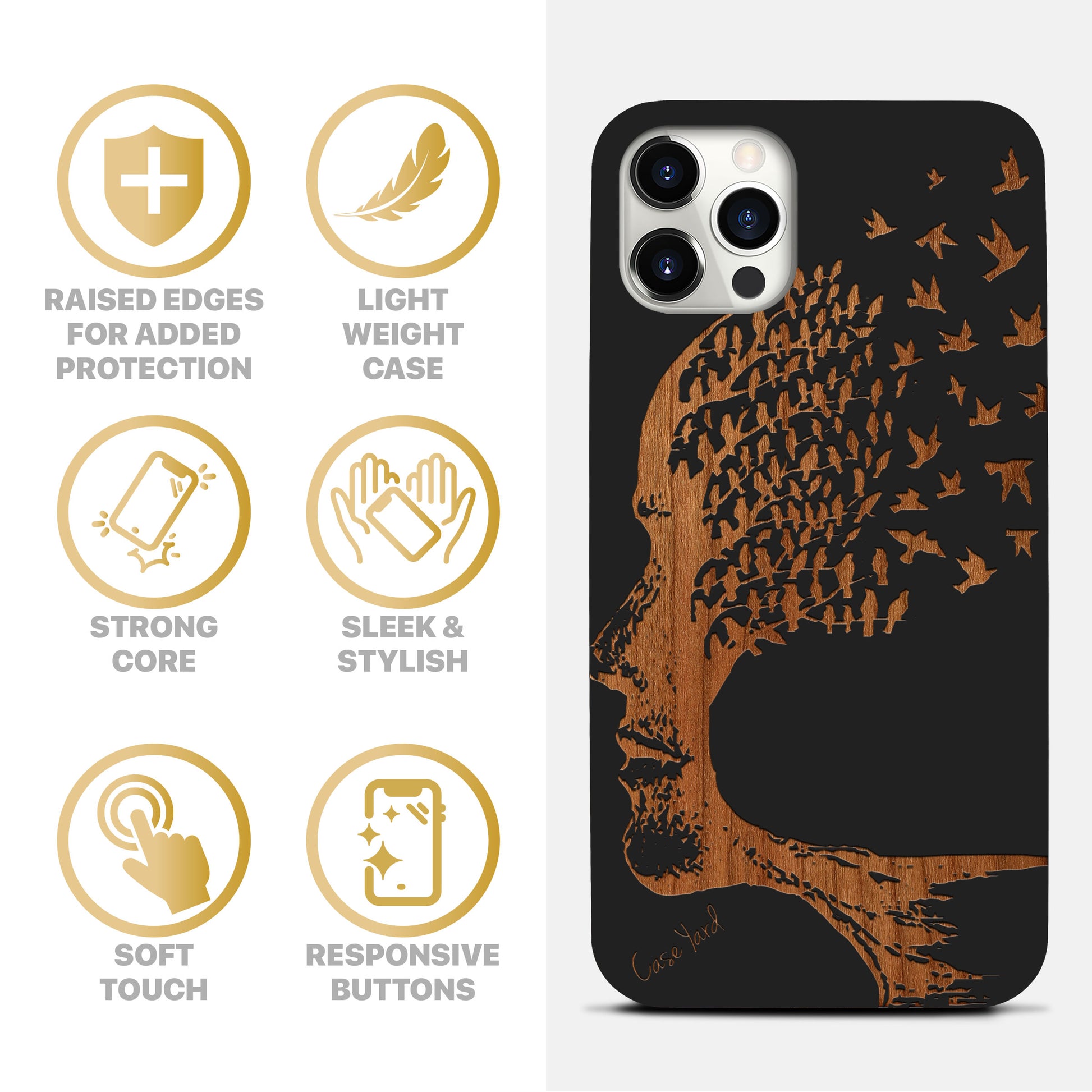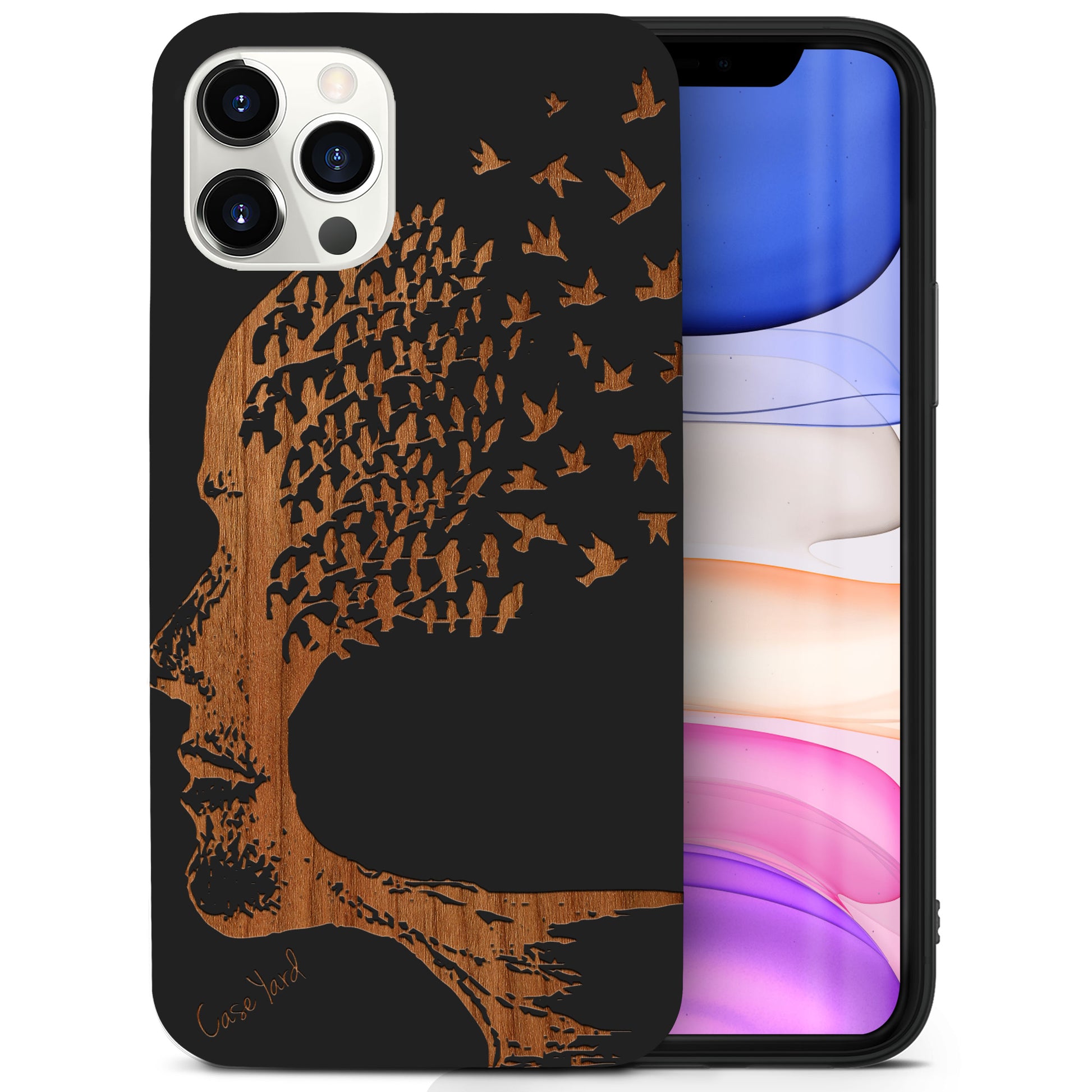 Head with Flying Birds Wooden Laser Engraved Phone Case